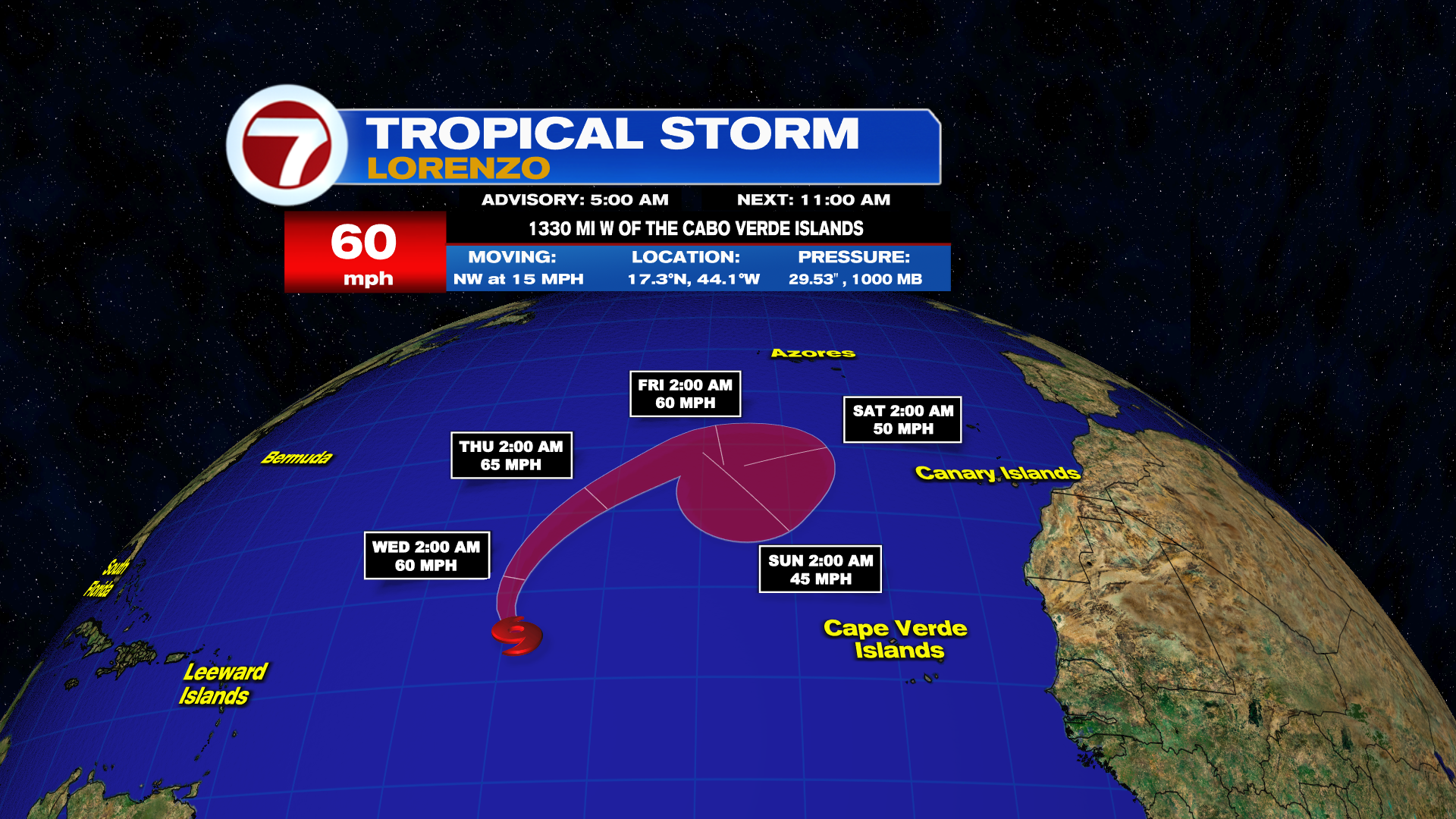 We are only tracking Tropical Storm Lorenzo in the Central Tropical Atlantic. It is a poorly organized tropical system that is going to loop around in the Atlantic and remain only a concern for the shipping lanes.