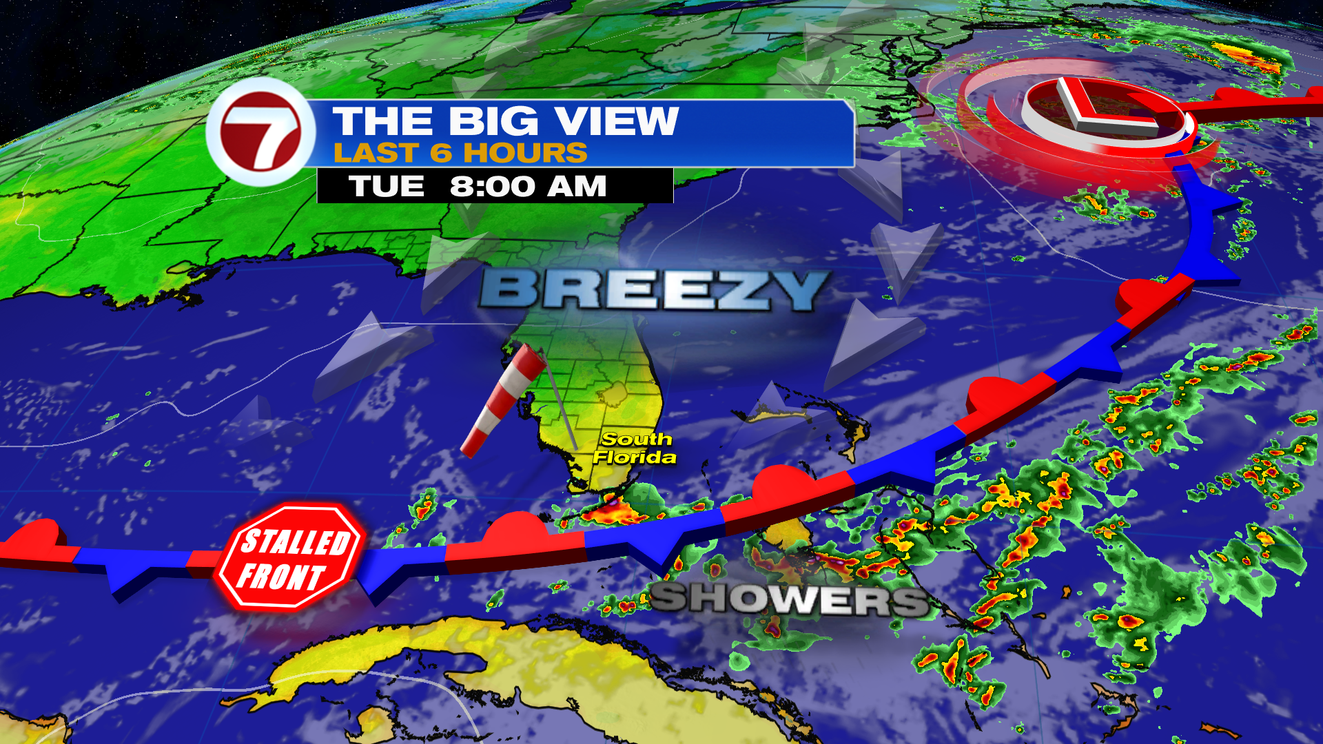 South Florida will remain mild and breezy through the middle of the week as we remain in between fronts. High pressure to the North with a stalled front to the South should maintain breezy and mild conditions around. However, the best chance of seeing a few showers will be around the Florida Keys today due to the front nearby.
